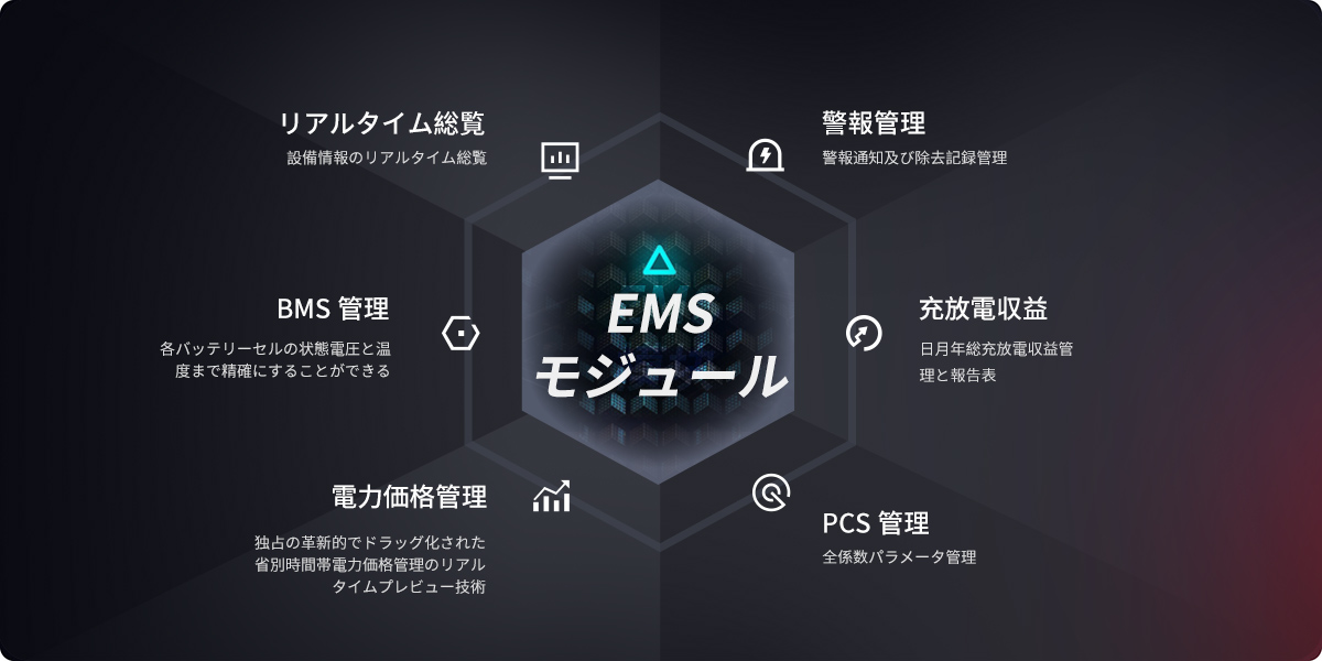 設備情報のリアルタイム総覧、パラメータ制御の秒級発行、警報通知及び除去記録管理、費用報告表統計、履歴データの精確検索、独占の革新的でドラッグ化された省別時間帯電力価格管理のリアルタイムプレビュー技術、PCS全システムパラメータ管理、BMS管理は各バッテリーセルの状態電圧と温度、日月年総充放電収益管理と報告表、エネルギー貯蔵キャビネットの消火消防モジュール制御、エアコンメーターの精確な計量制御まで精確にすることができ、テナントモードを保有し、複数の部下代理サブアカウントを管理、新設し、サブアカウントのEMS発電所を創建することができる。